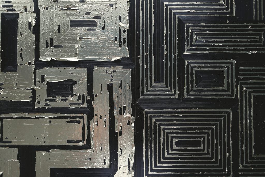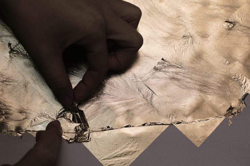 The making of gold leaf is a story of transformation through pressure. It begins with a pearl of solid gold placed between layers of vellum paper, the stack built up like a miniature geological core. Hammered in patient, repeating circles, the pearl spreads outward – thinner, wider, lighter with each strike. With the tremendous force of the hammer, subtle lines form in the sheet: sunburst striations radiating across the gold, like layers in the earth’s mantle compressed over time. Through this patient process, the metal becomes a sheet less than a micron thick — fragile, luminous, and ready to be laid onto a surface.