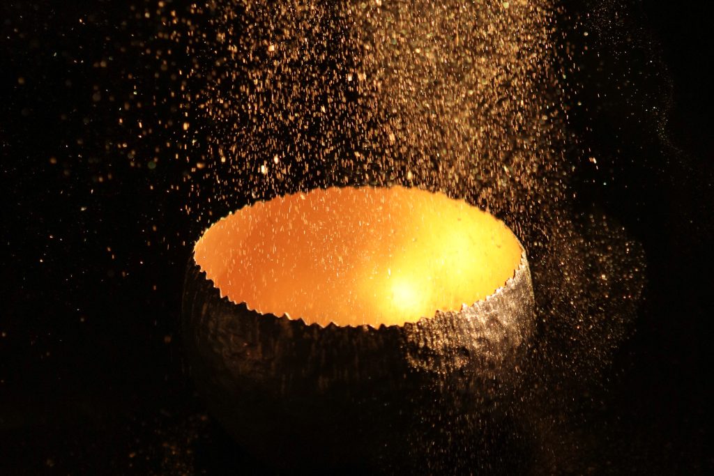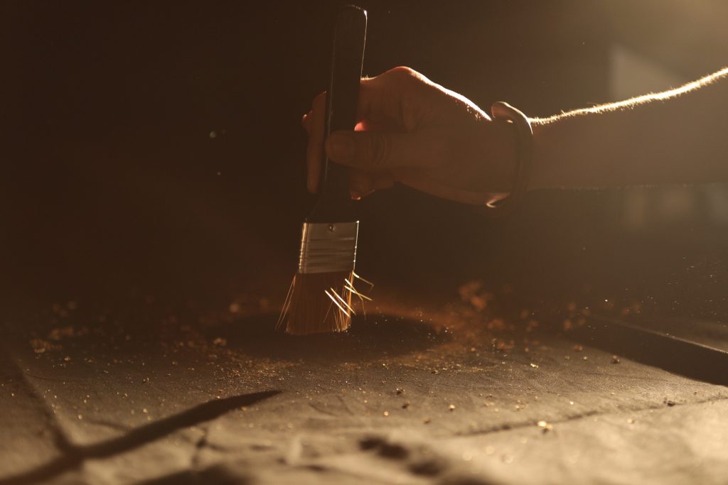 Gold is placed onto a surface by hand, pressed down by delicate fingers, and brushed away to reveal a new life infused with the material beneath, an afterglow. The gold is dusted away in flecks, almost excavated. The craft becomes an endeavour between artisan and object to bring light and reflection.