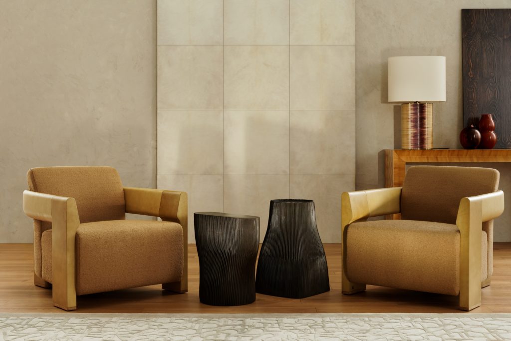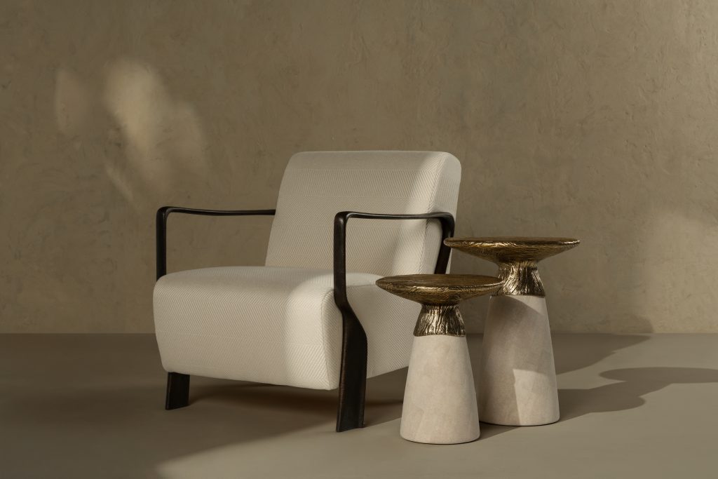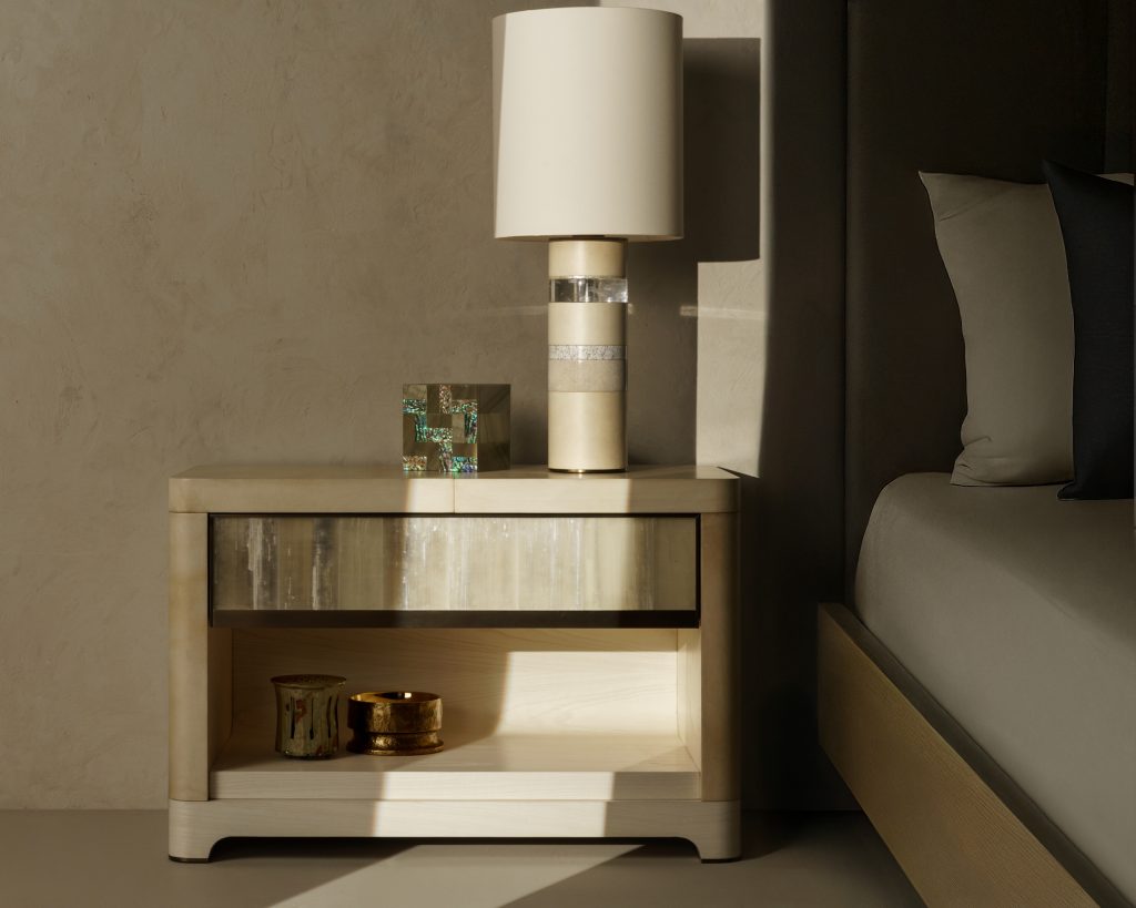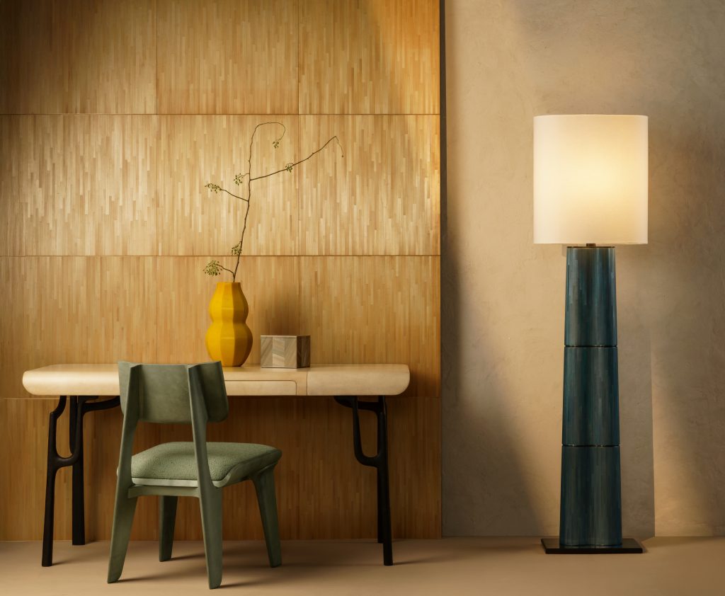 The Modern Scholar collection launching in 2026 is a meditation on the dance between the mind and the space it occupies. The surfaces invite touch, kindling space and room for thought. Parchment lies in smooth, grained planes; lacquer fractures gold and light into fine tessellations. Shagreen offers its aquatic calm. Bark and branch motifs are captured in glimmering straw marquetry and textured cast bronze. Forms are soft and accommodating.